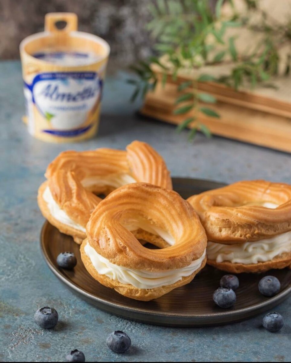 ИНГРЕДИЕНТЫ: Для теста: -слив масло- 50гр -вода- 125гр -сахар- щеп -соль- щеп -яйца- 2-3шт -мука- 90гр Для начинки: -твор сыр- 150гр -сливки 33%- 100гр -сах пудра- 80гр ПРИГОТОВЛЕНИЕ: -воду, слив масло, соль и сахар довести до кипения -убавить огонь, добавить муку и,помешивая, держать на огне 3мин -тесто соберётся в шар -снять с огня, чуть остудить и по одному вбить яйца, каждый раз размешивая -тесто не должно быть жидким, но свободно стекать с лопатки -разогреть дух до 200град, противень застелить пергаментом, тесто переложить в конд мешок -отсадить колечки d-8см на расст друг от друга, тк оно хорошо поднимается при выпечки и ему нужна циркуляция воздуха -отправить в духовку на 10-15мин, в процессе открывать нельзя, держим колечки до румяной корочки -для крема взбить твор сыр, сливки и сах пудру -колечки остудить, разрезать пополам -на нижнюю часть выложить крем и накрыть второй половинкой -посыпать сах пудрой ПРИЯТНОГО АППЕТИТА 🥰