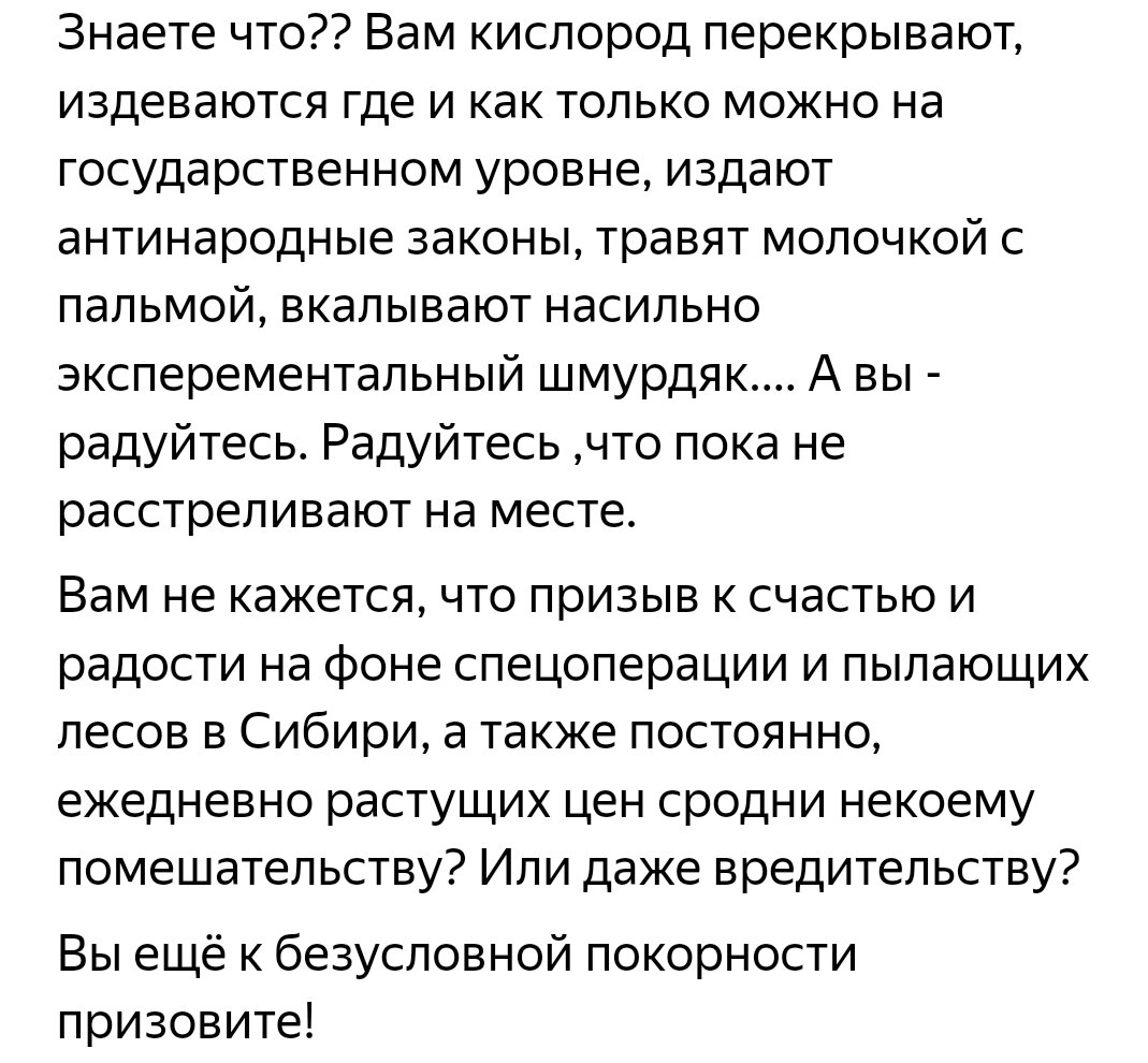 Под одной из статей о том, что даже с минимальной пенсией, даже в возрасте за 80 лет, даже с кучей болезней (возрастных, я имею ввиду) можно брать и радоваться жизни. Вот просто брать и радоваться. Что живы. Даже на фоне тяжёлых событий. Даже, если объективно нечему радоваться. Но, если вы живы, относительно жизнеспособны, есть еда, вода (да, некоторые и даже многие люди в наше время лишились такого блага, как вода), то можно брать и радоваться. Комментарий, который заставил меня написать ответ. Я не призываю никого к покорности. Но, мы, к сожалению, мало что можем изменить. Мы не можем прийти в магазин и купить хлеб по 10 рублей, приходится платить 30 рублей. Мы не можем купить сыр из натурального коровьего молока, потому что он или недоступен нам, или же стоит выше, час бюджет может позволить. Но, если жизнь и так очень короткая, то смысл брать и причитать? Что от этого изменится? Ровным счетом ничего. Нуль изменений. Наша жизнь нам показывает, что мы можем изменить только наше