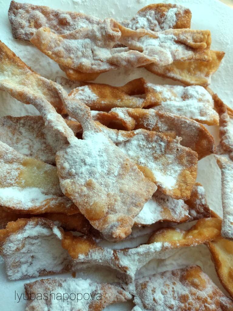 #готовимвместе #пикник #хворост 👩🏼🍳 Хворост - это рассыпчатое печенье из тонких полосок теста, изогнувшихся во время жарки в масле. 👩🏼🍳 Вкусный, аппетитный, простой в приготовлении, с добавлением водки, которая наполняет тесто пузырьками и делает его хрустящим. 👩🏼🍳 Спирт от большой температуры весь выветрится и хворост можно давать детям. Ингредиенты: муки, яйца, ложка водки, соли, мука для раскатки теста, подсолнечное масло для жарки, сахарная пудра для обсыпки Способ приготовления: В глубокой миске яйца перемешать с солью. Добавить ложку холодной водки. Постепенно ввести просеянную муку. Замесить тесто. Оно должно быть эластичным, однородным и не липнуть к рукам. Муки может понадобится чуть больше. Положить в пакет, припудренный мукой, отдыхать на 15 минут. Разрезать тесто пополам, оставшийся кусок накрыть полотенцем. Припудрить рабочую поверхность мукой и поочерёдно раскатать каждую половину в тонкий пласт, как можно тоньще. Нарезать тесто на полоски толщиной около 2 см,