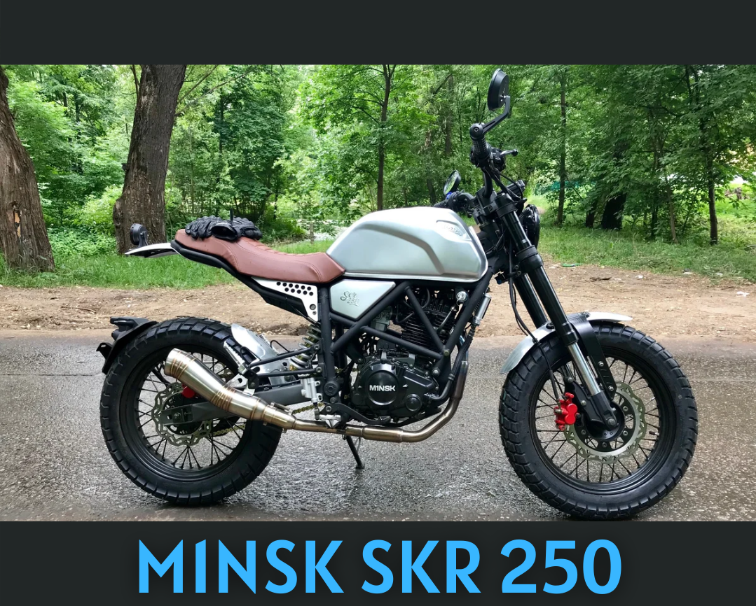 Мотоцикл M1NSK SKR250. Мотоцикл шоссейный, но по лёгкому бездорожью ехать можно. Объём двигателя 223 кубических сантиметра, подходит людям с ростом 170-185. Начнём с плюсов, 1 красивый дизайн, он не похож на типичный китайский мотоцикл, можно его назвать экзотическим мотоциклом в мире Китая. 2 плюс-это система торможения, она идёт из одного тройника, из-за этого когда совершается акт торможения, активируются 2 суппорта, передний тормозит на 30%, а задний на 70%. Покупать этот мотоцикл для начинающих безусловно хороший вариант. На нём лучше всего ездить на короткие расстояния, от кофейни до кафе, из-за 1 проблемы- громкий глушитель. Можно сказать, что этот мотоцикл для поездок по городу. 2 проблема-маленькая кубатура, эта проблема уже решена производителем. Производитель сказал, что будут ставить более мощные двигатели. 3 проблема-это не зафиксированные тормозные болты резьбовым клеем так как одноцилиндровый мотор создаёт много вибраций и болты выкручиваются, и из-за этого тормозная