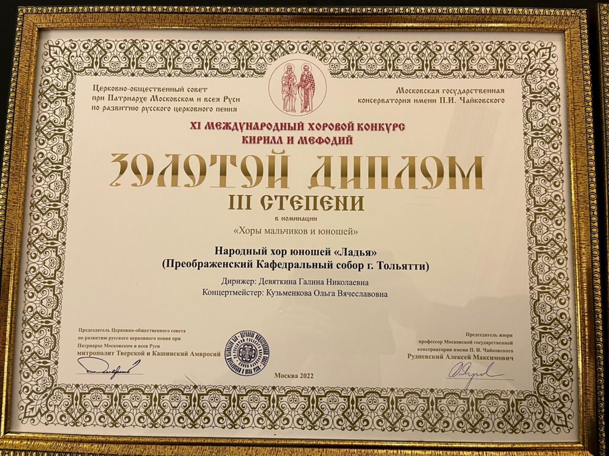 2 мая 2022 года народный хор юношей «ЛАДЬЯ» выступил в числе лауреатов международного конкурса-фестиваля «Кирилл и Мефодий» на сцене Рахманинского зала Московской государственной консерватории, представив Преображенский кафедральный собор Тольятти.