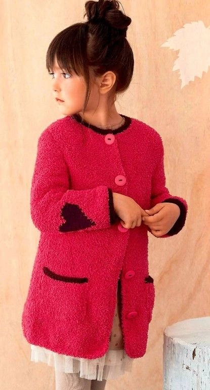 Малиновое пальто из мягкой пряжи с эффектом плюша, с карманами и большими пуговицами, украшено жаккардовыми узорами в виде сердечек Рост: 86 (102; 114; 126-138; 150) см Примерный возраст ребенка: 2 года (4; 6; 8-10; 12 лет) Вам потребуется: 200 (250; 300; 350; 450) г малиновой пряжи Phil Dоuсе (100% полиэстера; 50 г/86 м); 50 (50; 50; 100; 100) г бордовой пряжи Pаrtnеr 6 (50% полиамида, 25% шерсти, 25% акрила, 50 г/66 м); спицы № 5; крючок № 5; 5 (5; 5; 6; 6) пуговиц. Техника вязания. Платочная вязка: лиц. и изн. р. - лиц. п. Лицевая гладь: лиц. р. - лиц. п., изн. р. - изн. п. Жаккардовый узор: вязать по счётной схеме лиц. гладью. При смене цвета перекрещивать нити на изн. стороне, чтобы не возникало отверстий. Плотность вязания, лицевая гладь малиновой нитью или жаккардовый узор: 14 п. и 23 р. = 10 х 10 см. ОПИСАНИЕ РАБОТЫ Спинка: малиновой нитью набрать 49 (53; 57; 63; 71) п. и вязать жаккардовым узором по схеме. Убавить с обеих сторон в 14-м р. 1 х 1 п., в каждом 16
