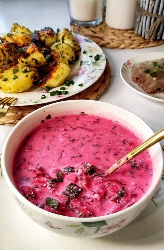 Холодник из свеклы на воде, подаётся со сметаной Ингредиенты: Вода, Свекла, Огурец, Яйца куриные вареные, Лук зелёный, Укроп, Петрушка, Сок половины лимона, Соль , Сахар , Уксус 9% по желанию, Редиска по желанию Способ приготовления: Воду довести до кипения и охладить до полного остывания. Свеклу запечь в духовке до готовности. Натереть на тёрке и сбрызнуть соком лимона, чтобы цвет оставался ярким. К свекла добавить измельчённые яйца, огурцы, редиску, укроп, петрушку, укроп. Залить холодной кипячёной водой, перемешать. Добавить соль и сахар по вкусу, надо пробовать, чтобы вкус был именно тот что надо👍 если не хватает кислинки добавляем сок лимона или уксус по вашему желанию. Отправить в холодильник настояться и подавать со сметаной.