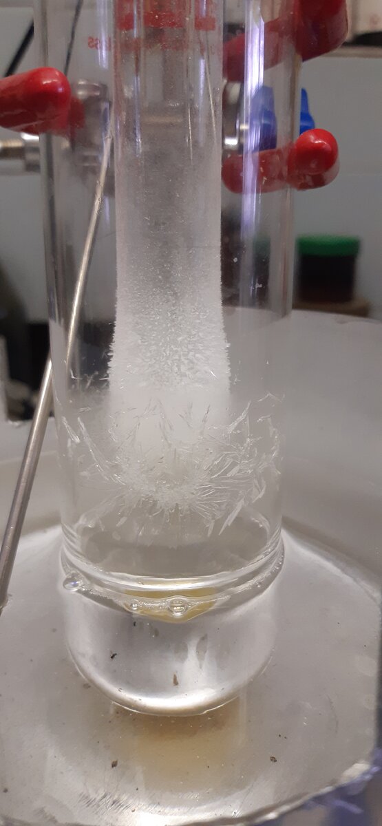 Сублимация, или возгонка - переход вещества из твердого состояния сразу в газообразное. Если примеси нелетучи, этим способом от них можно избавиться. Как узнать, что вещество будет сублимироваться? В реальности - методом научного тыка)) Но косвенный признак этого - либо наличие запаха, либо незначительная сублимация в выпарной колбе в ходе сушки вещества на роторе. Для проведения сублимации вещества используется сублиматор. У меня в лабе сублиматор от Сигмы. По описанию, можно сублимировать до 25 грамм вещества. Стоит, правда, он весьма дорого. Смысл работы - простой. Откачанный сублиматор (вакуум должен быть хороший, у меня был 2 мм. рт. ст.) погружается в силиконовое масло, которое нагревается до нужной температуры. Сублимирующееся вещество конденсируется на "холодном пальце". Последний - своего рода холодильник, через который течет холодная вода. Почему шлиф обратный, т.е. "папа", он же cone? Чтобы при вынимании "пальца" с конденсированным веществом оно не соприкасалось с вакуумной