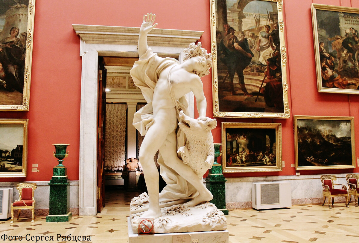 В Санкт-Петербурге, в Государственном Эрмитаже, в Большом итальянском просвете, так называется один из трёх парадных залов музея, среди монументальных полотен Л. Джордано, А. Канале, Дж. Креспи, и Ф. Гварди располагается скульптура «Гибель Адониса» итальянского мастера Джузеппе Маццуолы (1644-1725), ученика самого Лоренцо Бернини (1598-1680).