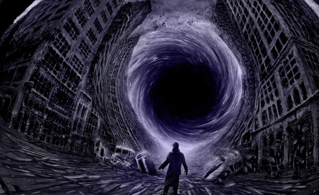 В этот самый момент наверху засияла ещё одна вспышка. Поднялся шквалистый ветер, унося тучи и поднимая гул. В небе начало что-то пульсировать. Вокруг стало темно, как ночью.