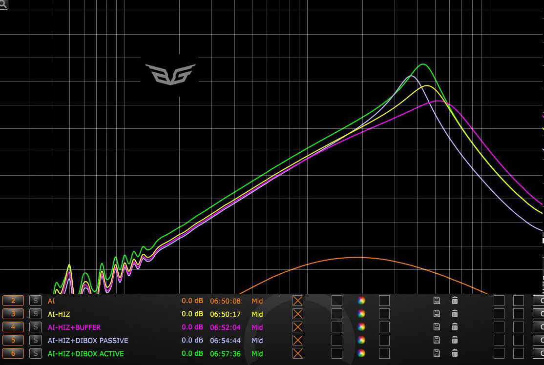 Видно, что DI-box меньше всего нагружает звукосниматель, высокая добротность и выхлоп. Но его емкость, скорее всего из-за трансформатора, больше (особенно у пассивного), чем у буфера, поэто