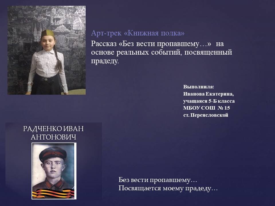 Рассказ "Без вести пропавшему..." Иванова Екатерина МБОУ СОШ № 15 ст. Переясловская Арт-трек "Книжна полка"