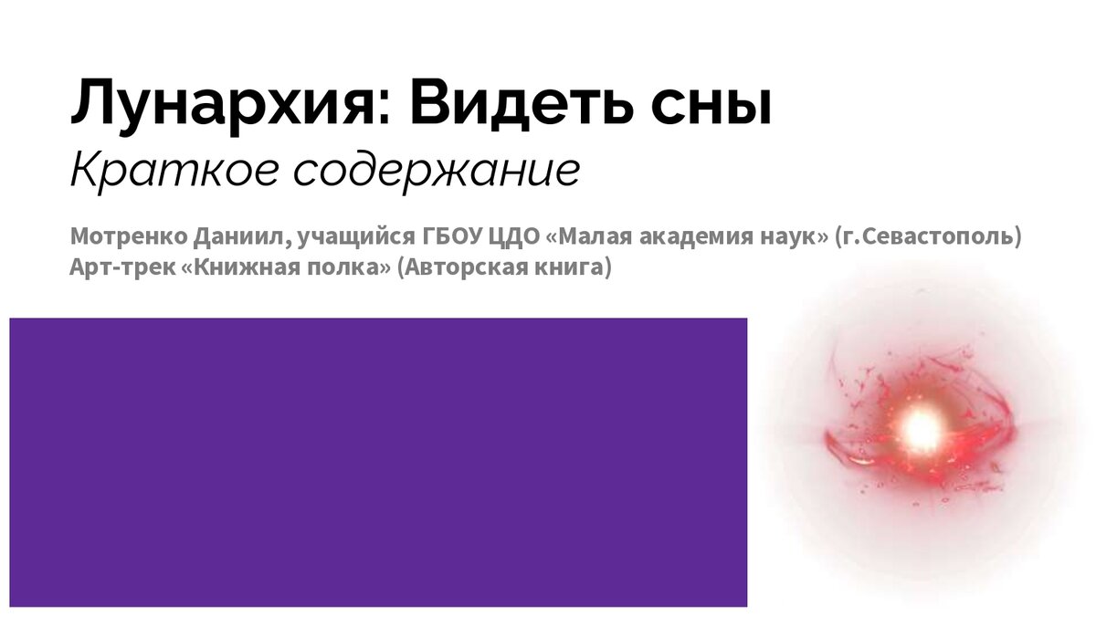 "Лунархия" Знакомьтесь, юный писатель-фантаст Даниил Мотренко и его загадочная страна снов Лунархия! Видеть сны может каждый, но разгадать их - дело не простое. Машина снов, радужный камень и много других неожиданных вещей встретятся в этой книге. Но главное - не дать Кошмару овладеть вашими снами. Даниил Мотренко, учащийся ГБОУ ЦДО "Малая академия наук" (г.Севастополь), арт-трек "Книжная полка" (Авторская книга)