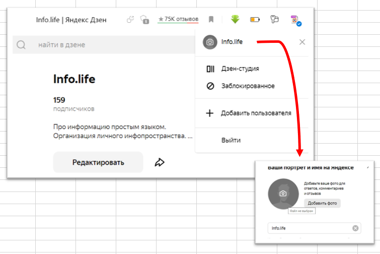 Вы можете также это сделать через приложение Дзен. Нажимаю на аватар в правом верхнем углу, открывается окошко: