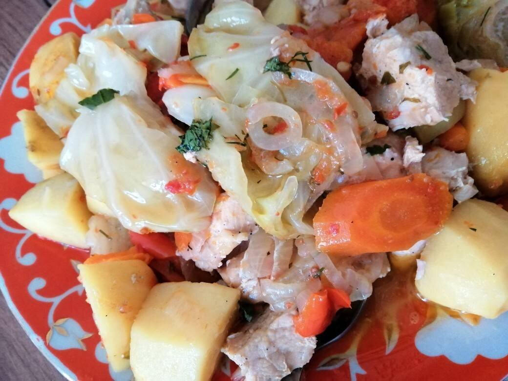 #восточнаякухня #пикник Блюдо узбекской кухни обычно готовится с мясом, чаще с бараниной, и большим количеством свежих овощей. Очень легко и просто приготовить, вкусное, полезное и яркое блюдо с чудесным ароматом. Можно приготовить на пикнике в казане для большой компании. Предлагаю приготовить с курицей. Ингредиенты: курица;, лук репчатый;, морковь свежая;, перец болгарский сладкий;, помидор;, картофель;, капуста;, чеснока;, по вкусу соль, перец молотый, кумин, кориандр;, зелени разной;, растительное масло Способ приготовления: Подготовить все ингредиенты. Мясо курицы нарезать на порционные кусочки. Лук нарезать полукольцами, морковь продолговатыми кусочками, перец крупным кубиком. Картофель нарезать,четвертинками, а некрупный можно даже оставить целымм. Капусту - крупными кусками. В казане в небольшом количестве масла растительного обжарить жир куриный и слоями выложить мясо, чеснок целыми зубчиками, лук, морковь, перец, картофель, капусту, нарезанные тонкими кружочками помидоры, пос