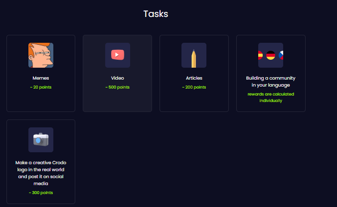 Всем привет и сегодня мы обсудим новую эпоху амбассадорской программы crodo io. Сейчас я вам расскажу о том, что же изменилось в зданиях с приходом новой эпохи crodo io. В общем то задания не изменились, поменялась оплата за них. Ниже прикреплю скрин Пройдемся по изменениям. Как я и говорил, задания не поменялись. Поменялась оплата за них, получается, что за мемы теперь платят 20 вместо 50 баллов, за видео ролик платят 500 вместо 300 баллов и за статью платят 200 вместо 100. Получается практически все позиции повысили кроме мемов, возможно это связанно с тем, что мемы делали в ненормальных объёмах и забивали на статьи и видео. Скорее всего это и вызвало рост оплаты за остальные задания и снижение за мемы . По окончанию этой эпохи ничего не известно, но понятно что лучше начинать топить прямо сейчас. Так как заданий проверено очень мало и можно неплохое количество crod токенов набрать. Для меня целью на эту эпоху является получение большего результата чем в первой. Минимально 0.2%