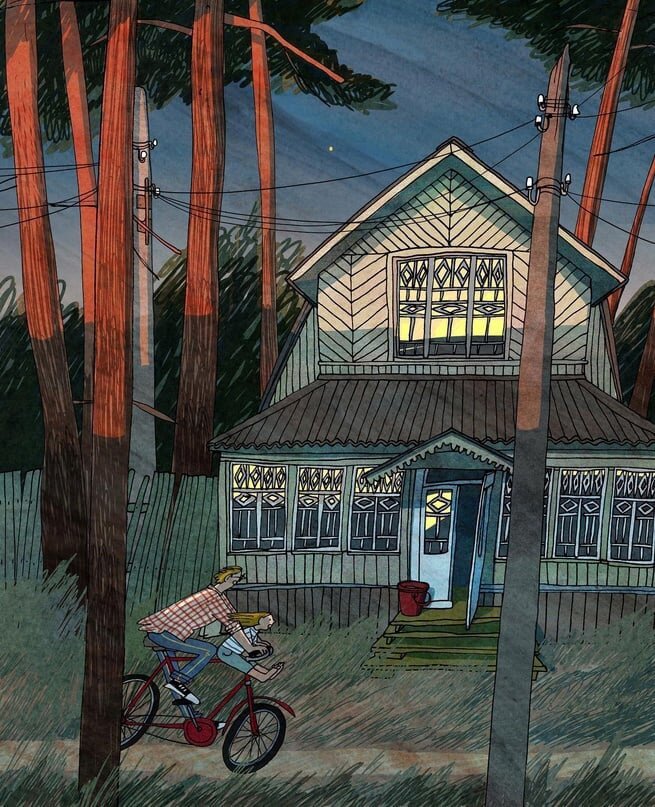 Под вечер окна — золотым и жёлтым. Темнеют сосны, крутится педаль.