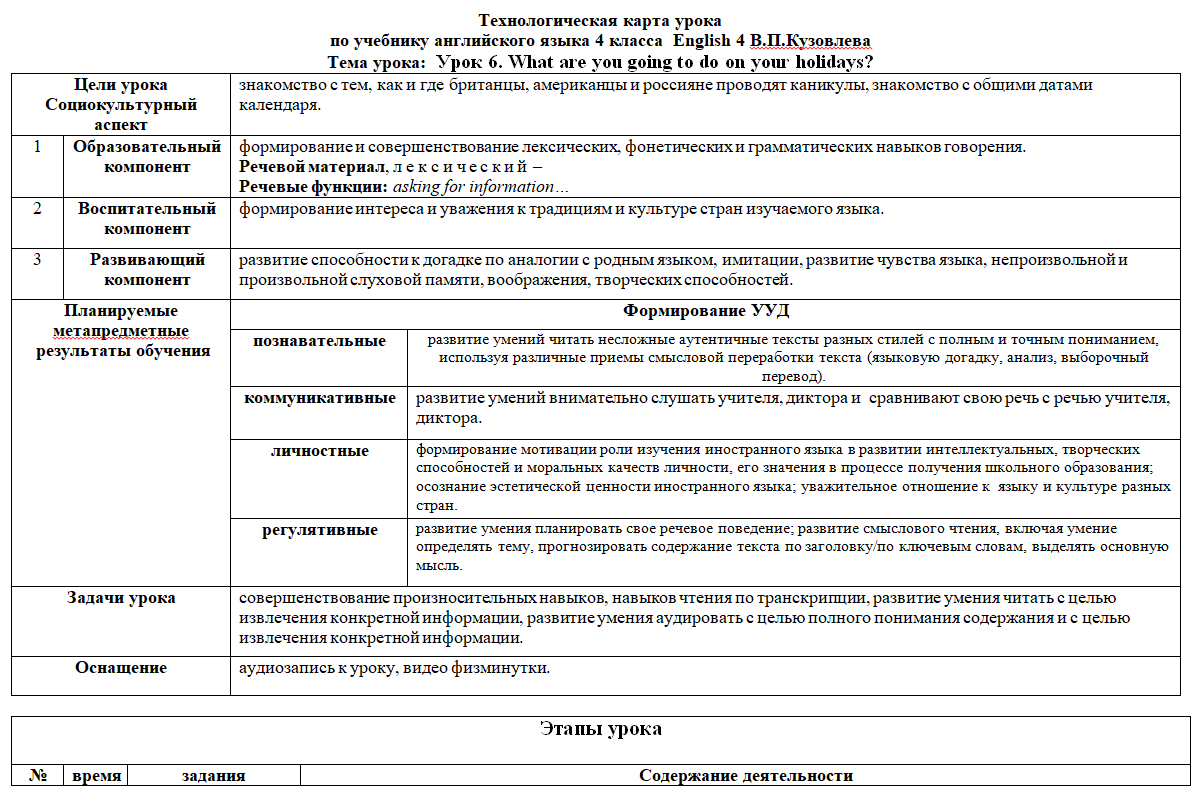 Технологическая карта урока 4 класса English 4 В.П.Кузовлева Тема урока: Урок 6. What are you going to do on your holidays?