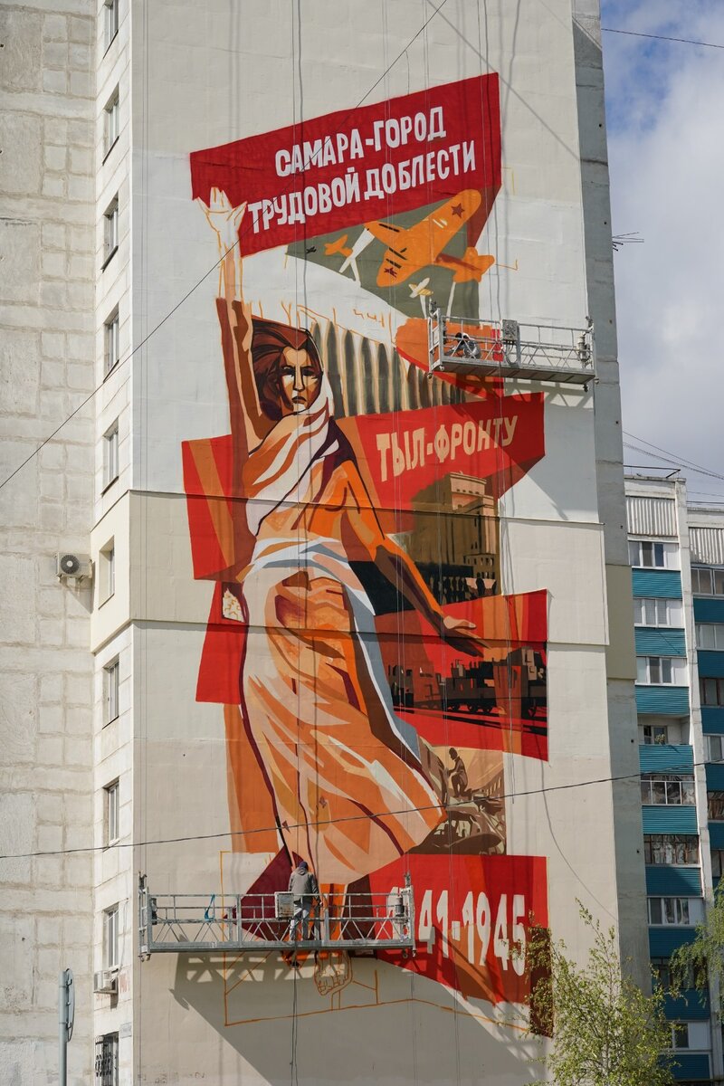 #Искусство #Самара В областной столице завершаются работы над новым муралом. Произведение уличного искусства украсило фасад дома № 146 по улице Победы. По словам художника-исполнителя Дмитрия Ушакова, работа над деталями займет еще 1-2 дня, и тогда мурал предстанет перед самарцами во всей красе. Он стилизован под жанр советского плаката, и внимательный зритель сможет увидеть отсылки к эвакуации в Куйбышев заводов и предприятий, легендарный штурмовик ИЛ-2, основные моменты культурной жизни запасной столицы, например завершение и исполнение в городе Седьмой ("Ленинградской") симфонии Дмитрия Шостаковича в Театре оперы и балета. Центральной фигурой мурала стала Родина-мать. "Замысел — отобразить знаковые моменты истории нашего города в годы Великой Отечественной войны, героический подвиг наших предков, женщин-тружениц, которые на своих плечах вынесли все тяготы того времени. Изображение выполнено в жанре советского плаката", — рассказал член Творческого союза художников России, автор эски