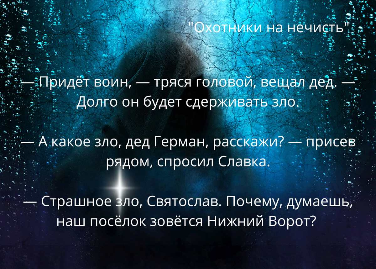 — Страшное зло, Святослав. Почему, думаешь, наш посёлок зовётся Нижний Ворот? Потому что здесь, на этом самом месте, — сказал Герман, стуча своей палкой по земле, — испокон веков были двери в самую Навь, мир мёртвых, понимаешь? Чуждый нам мир, непонятный. Лезла оттуда всякая нечисть. Оттого и первые жители в этих местах — колдуны да ведьмы.