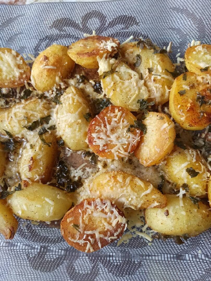 #пикник Запечённый картофель на гарнир к шашлыку 😃. Быстро, просто и очень вкусно 😋. Пробуйте 🤗. Ингредиенты: картофель мелкий, чеснока, сыр пармезан, итальянские приправы, оливковое масло, петрушка, паприка молотая, соль , слив. масло Способ приготовления: Приготовить все необходимые ингредиенты. Картофель очистить, промыть и разрезать на половинки. В нагретую сковороду с оливковым маслом выложить картофель и жарить, мешая, до образования хрустящей корочки. Картофель посолить, посыпать паприкой, приправами и добавить крупно нарезанный чеснок. Перемешать с картофелем. Выключить огонь, переложить картофель в форму для запекания, посыпать блюдо натертым сыром и рубленой петрушкой. Запекать в духовке при 195 °С 15 мин. На приготовленное блюдо выложить порезанное кубиками масло и подать к столу. Приятного аппетита 😋!!! Если Вам понравился мой рецепт и Вы приготовили по нему-мне будет очень приятно, если оставите свой фотоотзыв 🤗🥰. Интересно посмотреть, что у Вас получилось ❤️💐🤩. Мо