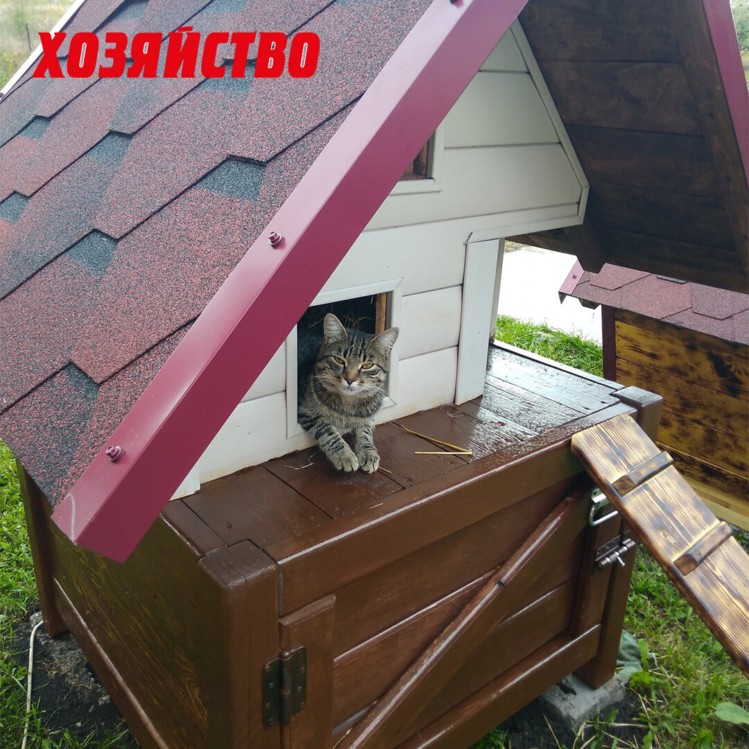 По непогоде сидят и ждут нашего приезда. Жалко усатых. Ну, и мы с сыном решили сделать им собственный дом. Пусть там коротают время, пока мы не дома. Домик решили сделать основательным. Матвейка включился в работу с полной отдачей. На домик он каждую досочку пропустил через рейсмус. Сначала мы изготовили тумбу под основание, собрали ее на четырех массивных ногах 100х100 мм. Простругали их в рейсмусе, фрезером свалили фаски на досочках. Все соединения припиливали на торцовочнике. На тумбе собрали сам домик. Ничего предварительно не эскизировали, собирали по наитию. Работа шла быстро, мы увлеклись так, что не успели даже все подробно сфотографировать. К вечеру второго дня домик был почти готов. Доска от поддонов, брусочки 40х40 в качестве каркаса, второй этаж утеплен минватой и фольгоизолоном − все это осталось в гараже после строительства.