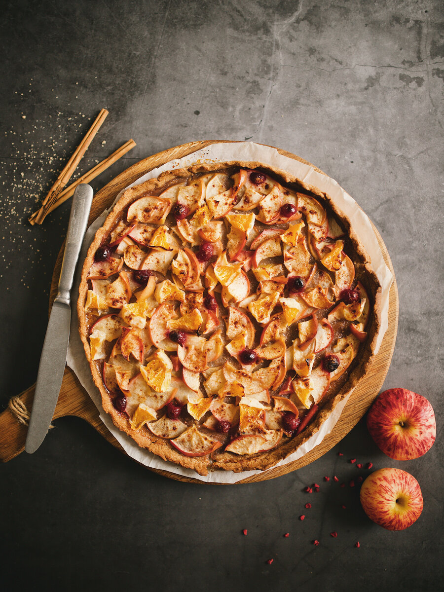 Проще – только грызть яблоки просто так, периодически прикусывая апельсин! Галета - это было всегда что-то грубое и простое, еда для быстрого перекуса во время палящего обеденного солнца либо долгих переходов через леса и реки. Грубые снеки позволяли дотянуть до ближайшей деревни, чтобы картинно рухнуть на пороге крайнего дома от упадка сил, надеясь, что встретит румяная хозяйка с горшком каши, а не хмурый хозяин с топором. В наше время довести себя до изнеможения можно только на 10-дневном голодании, поэтому и идея галеты выросла, трансформировалась и расцвела новыми легендами. Попробуйте мою: ароматную, осеннюю и очень сочную. По правде говоря, начинки в ней куда больше, чем самой галеты, но дух-то всё равно остался! Финны бы непременно вспомнили своё «hygge» и стали бы выяснять рецепт! ИНГРЕДИЕНТЫ (на форму D=25 см): Корж: Начинка: ПРИГОТОВЛЕНИЕ: 1. Смешайте все ингредиенты для коржа. 2. Раскатайте тесто в круг, выложите в разъемную форму либо круг для пиццы, сформируйте бортики.