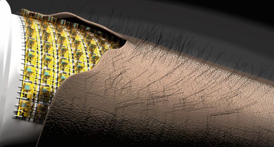 Кожа – самый большой орган человека, который играет ключевую роль, но чувствительность кожи трудно воспроизвести в искусственных аналогах. Недавно исследователи разработали новый тип электронной кожи с крошечными встроенными волосиками, которые позволят точнее передавать прикосновения. Прототип представляет собой тонкие пленки материала с электропроводными свойствами, которые позволяют улавливать прикосновения, ощущать давление, температуру и даже боль. Исследователи из университета Хемница и университета имени Лейбница поняли, что все ранние прототипы не учитывают одну важную деталь кожи – крошечные волоски на поверхности, которые играют ключевую роль в осязательной функции. Учёные интегрировали магнитные волоски в эластомерный материал поверхности. Как и у настоящих волос у прототипа есть луковичные корни, которые перемещаются при прикосновении. Каждый волос окружён магнитным 3D датчиком, отслеживающим положение корня. Это позволит всей матрице датчиков регистрировать не только прико