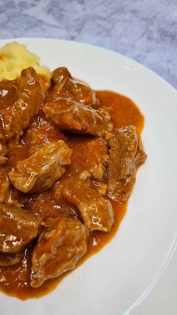 ГУЛЯШ по этому рецепту получится абсолютно у каждого!! Ингредиенты: Первым делом я разделываю свинину: срезаю лишний жир и жилки. Затем нарезаю брусочками и немного обжариваю на растительном масле. Когда вода почти выпарится добавляю муку и еще немного обжариваю. Затем лук с морковью и также обжариваю буквально на пару минут. Томатную пасту развожу в 1 л. воды, сюда же добавляю соль и перец и заливаю мясо. Далее оставляю томиться на медленном огне под закрытой крышкой минут на 40. Смотрите по конситстенции. Лишняя вожа должна выпариться, а гуляш немного загустеть (до консистенции жидкой сметаны). Приятного Вам аппетита!
