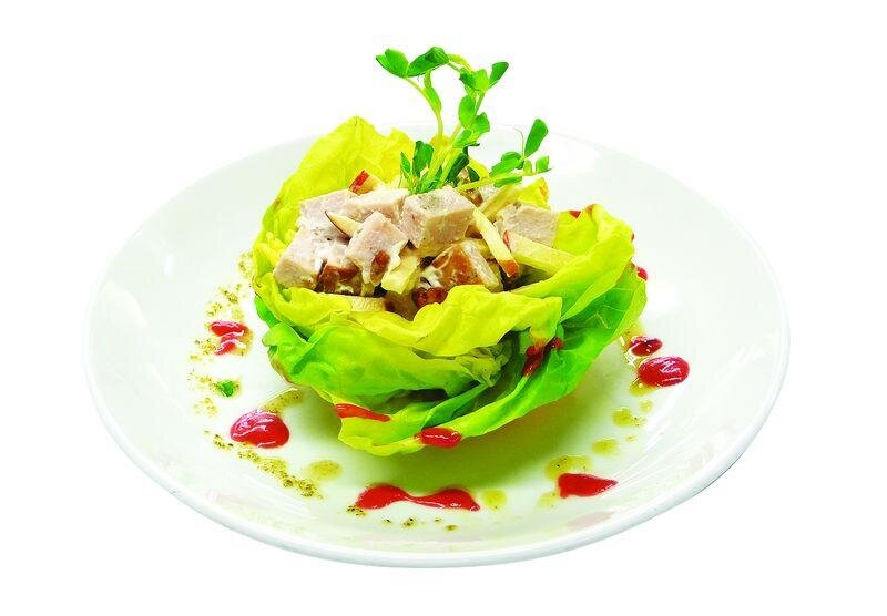 Филе вареного или жареного рябчика (куропатки или курицы), вареный картофель, огурцы или корнишоны, сваренное вкрутую яйцо и очищенное яблоко, нарезать тонкими ломтиками, листья салата нарезать на 2-3 части каждый. Сложить все это в миску, посолить и смешать с майонезом, добавив уксус или лимонный сок, сахарную пудру. Заправленный салат уложить горкой в салатник, украсить листиками зеленого салата и дольками сваренных вкрутую яиц, а так же ломтиками помидоров и свежих огурцов. На 1 рябчика (1 куропатку или ¼ курицы) – 4-5 шт. вареного картофеля , 2 свежих или соленых огурца, 100 грамм салата, 2 яйца, 1 яблоко, ½ стакана майонеза, ½ ст. ложки томатного соуса, 1 ст. ложку уксуса или лимонного сока, ½ чайной ложки сахарной пудры.