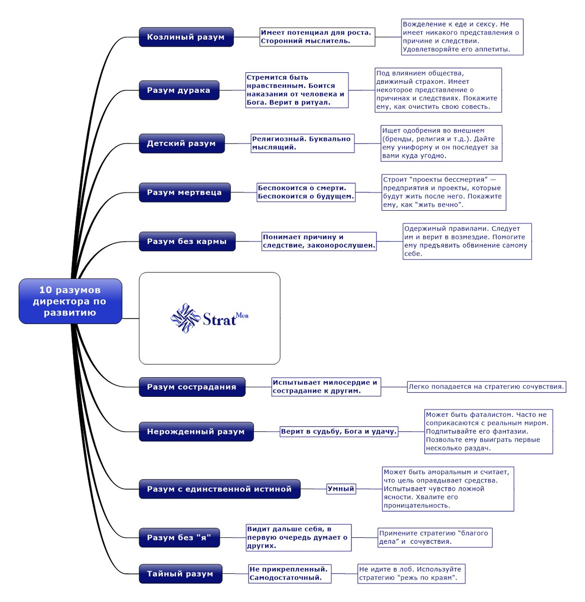 Согласно японскому буддийскому мастеру Сингон Кукаю (он же Кобо Дайши, 774-835 гг. н.э.), существует десять “уровней” (или типов) человеческого разума. То, что Кукай обнаружил (или, по крайней мере, усовершенствовал в ходе своих исследований в Китае), - это десять уровней понимания и осознания (дзюдзюшин), на которых функционируют все человеческие существа. Практикующие сингон рассматривают каждый из этих десяти разумов как еще одну ступеньку на пути к просветлению. Сначала мы “владеем” ими, а затем выходим за их пределы. Но мы никогда не должны довольствоваться тем, что находимся в их ловушке. Изучение этих десяти умов директорами по развитию позволяет им реалистично оценить свой “уровень функционирования”, то есть то, как они видят мир: например, через “Козлиный разум”, жизнь, в которой доминируют похоти; или же дальше по этому ментальному тотемному столбу они могут проявить “Детский разум”, став религиозными, хотя и догматически (Lean,TOC,Agile и т.д). На вершине они достигают состо