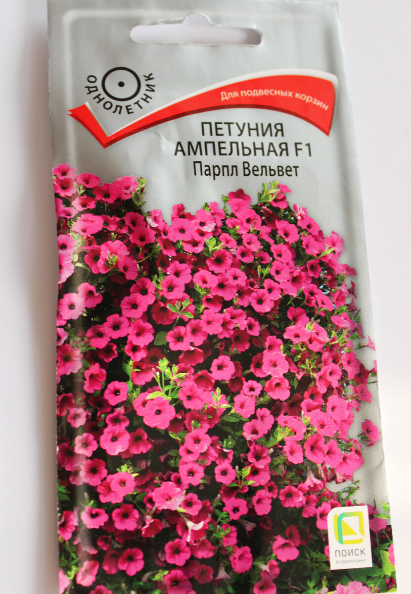 Петуния - этот однолетний очаровательный цветок сажаю каждый год на рассаду и потом пересаживаю в подвесные кашпо, иногда я собираю семена со своих выращенных цветов петунии для посева в будущем, но в сезоне 2021 я этого не сделала и пришлось покупать. Одна из приобретённых - это ампельная "Парпл Вельвет": Цена пакетика 80 рублей - многовато, на мой взгляд, за 5 штучек семян в пачке. Приобреталось 2 пакетика. Семена были высажены на рассаду в феврале и из 10 семян взошло 4: Апрель и петуния зацвела на окне: Цвет совпадает, диаметр цветка чуть меньше 5 см, что, в принципе, тоже совпало. Погодные условия пока не дают высадить цветы в кашпо на улицу, поэтому пока петуния ютится на окне в более стеснённых условиях. В дальнейшем останется проверить на соответствие описания семян с длиной свисающих побегов 80-100 см. Прошёл почти месяц, петуния всё еще дома и стала давать свисающие побеги длиной примерно 50-60 см: Конечно, ей не очень удобно в небольшом горшке, но описание сорта, видимо,