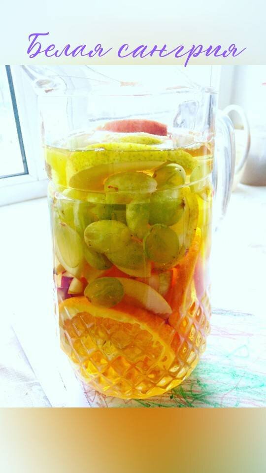 Май - сезон пикников, шашлыков и, конечно, вкусных напитков. Предлагаю попробовать белую сангрию - напиток из вина на фруктах. Лёгкий и ароматный. Готовый напиток можно перелить в термос, добавить лёд и он станет украшением пикника 18+ #пикник Ингредиенты: белого полусладкого вина, апельсин, яблоко, груша, ягод винограда, ягодной настойки (у меня морошка) или водки, сахара Способ приготовления: Фрукты помыть, из яблок и груш удалить семенные коробочки, нарезать: апельсины кружками, яблоки и груши полукругом, виноградины разрезать пополам. В кувшин выложить фрукты. Добавить сахар. Влить настойку и затем залить фрукты вином. Аккуратно перемешать, кувшин закрыть пленкой и убрать в холодильник на 3-4 часа, или на ночь. Подавать охлажденным, по желанию можно разбавить содовой или добавить лёд. Фрукты можно есть - они выходят интересные.