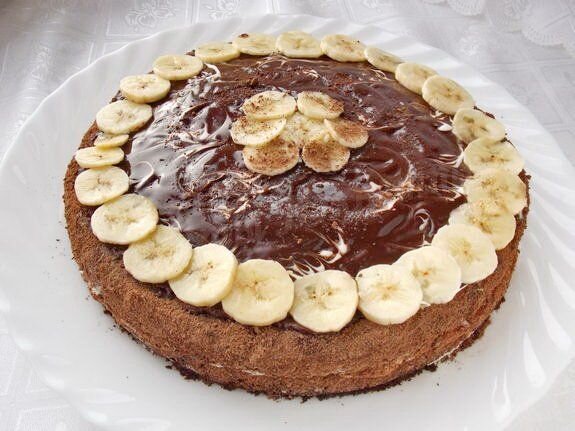 Шоколадный торт с бананом можно готовить по поводу и даже без, если озаботиться этим заранее. Только никакой спешки! Например, стоит спокойно дождаться, когда полностью остынет выпеченная основа торта: так ее будет легче разрезать на коржи. Хорошей идеей будет разделить процесс приготовления десерта на два дня. В первый испеките основу, во второй — разрежьте ее на коржи, сделайте крем и соберите торт. Кстати, от шоколадной глазури вы можете отказаться, выбрав свой собственный вариант украшения десерта (шоколадная стружка, кондитерская посыпка, свежие фрукты). ИНГРЕДИЕНТЫ Для глазури и украшения: Для крема: ПОШАГОВЫЙ РЕЦЕПТ ПРИГОТОВЛЕНИЯ Шаг 1 Приготовьте тесто для основы торта. В одну миску насыпьте 200 г сахара. Добавьте все яйца и взбейте миксером до получения пышной массы однородной консистенции. Шаг 2 В другой миске соедините молоко, соль и разрыхлитель. Тщательно перемешайте. Влейте растительное масло. Снова тщательно перемешайте. Перелейте в миску с яичной массой и взбейте миксер