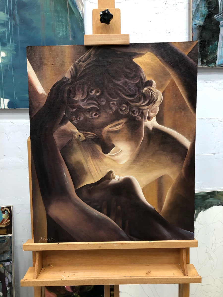 Картина выполнена с фотографии статуи из Эрмитажа «Амур и Психея» скульптора Антонио Канове.