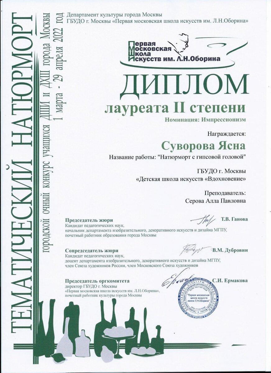 С 1 марта по 29 апреля 2022 года в ГБУДО г. Москвы «Первая московская школа искусств им. Л.Н. Оборина» проводилась Городская выставка-конкурс учащихся ДХШ и ДШИ города Москвы «Тематический натюрморт – 2022». На Конкурс были представлены творческие работы, выполненные в техниках: живописи, графики, ДПИ и скульптуры и в любых других исполнениях, отвечающих замыслу произведения, по следующим номинациям: · Реализм · Символизм · Импрессионизм · Пуантилизм · Модерн · Фовизм · Кубизм · Сюрреализм · Оп-арт · Поп-арт Жюри определяло победителей Конкурса по наибольшему количеству баллов. Работы участников оценивались по следующим критериям: · соответствие тематике конкурса; · выразительность и полнота раскрытия художественного образа в выбранном стиле; · художественный уровень и мастерство исполнения; · творческая индивидуальность и самостоятельность. В конкурсе принимали участие 186 человек. Нашу школу представляли: Номинация «Импрессионизм» Суворова Ясна (13 лет) «Натюр