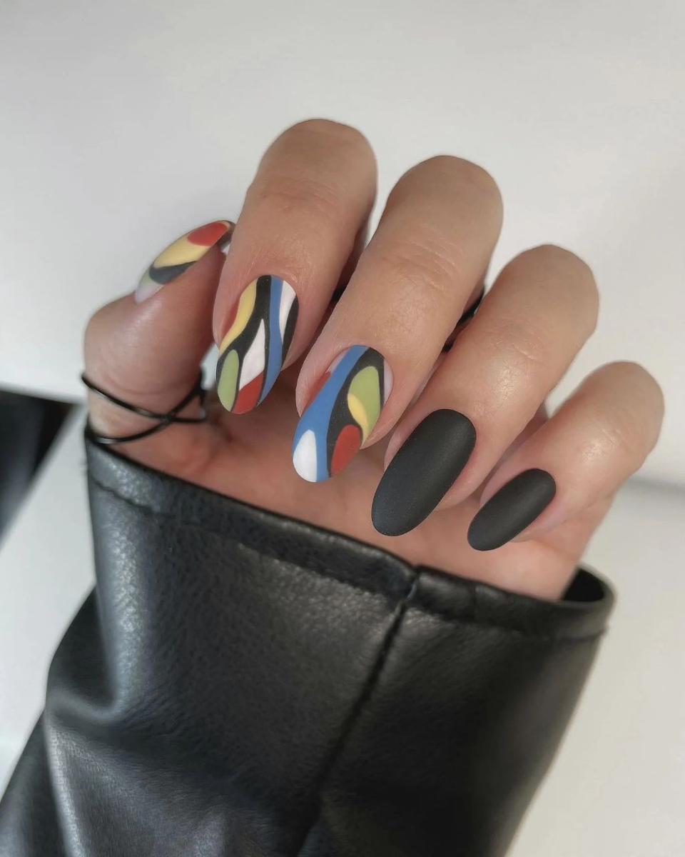 Дизайны, напоминающие полотна художников-абстракционистов, сейчас на пике популярности. Хорошо смотрятся как сочетания разных оттенков одного цвета, так и совершено контрастные цвета. А если хотите, чтобы маникюр выглядел супер стильно - покройте ноготки матовым топом. Подпишись на невероятно интересный канал про маникюр