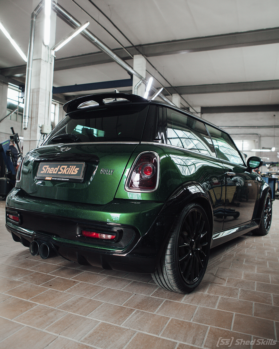 Маленький, резвый и очень привлекательный автомобиль заезжал к нам, в ShedSkills, на установку даунпайпа. Mini Cooper S Bully.