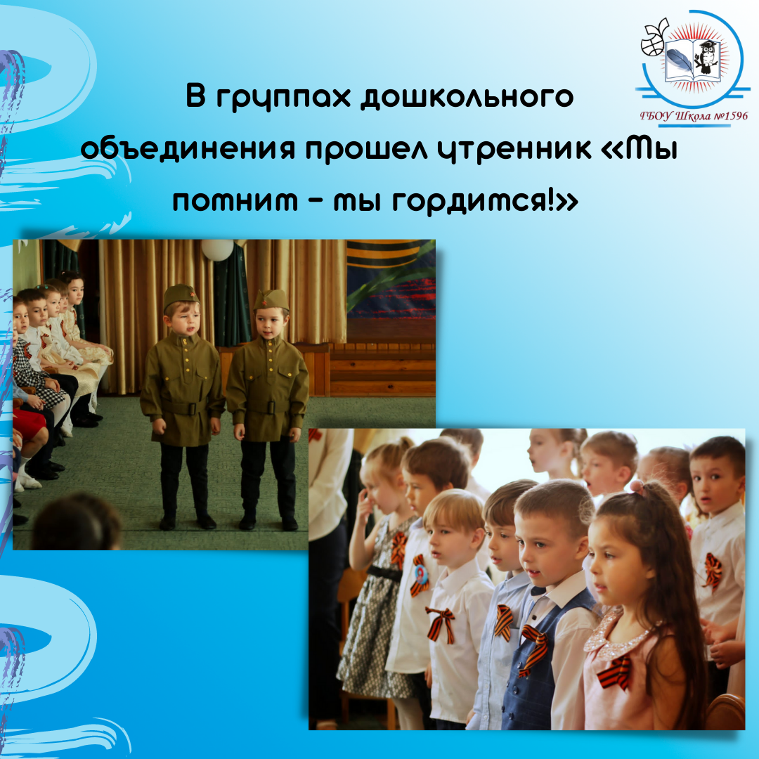 В честь празднования 77-летия Дня Победы в старших группах дошкольного объединения (Приречная ул., д.9 – ДО №1755) прошел утренник «Мы помним – мы гордимся!» (музыкальный руководитель Прошкина Л. В.). Ребята читали стихи о войне, показывали сценки по теме, проводили эстафеты с препятствиями, устроили в честь праздника салют из разноцветных флажков. Также с удовольствием пели военные песни. Дети группы №8 со своими воспитателями Колодиной Т. М. и Ананян С. А. выучили песню «Алеша» и рассказали ребятам с других групп о памятнике русскому солдату в Болгарии. Воспитанники группы №9 (воспитатели Бердова Н. В. и Тихомирова М. Л.) решили выучить песню «Три танкиста». А группа №6 группа вместе с воспитателями Вавиловой Т. С. и Мишенковой Е. А. порадовали всех исполнением песни «Катюша». #школа1596 #до1755 #школымосквы
