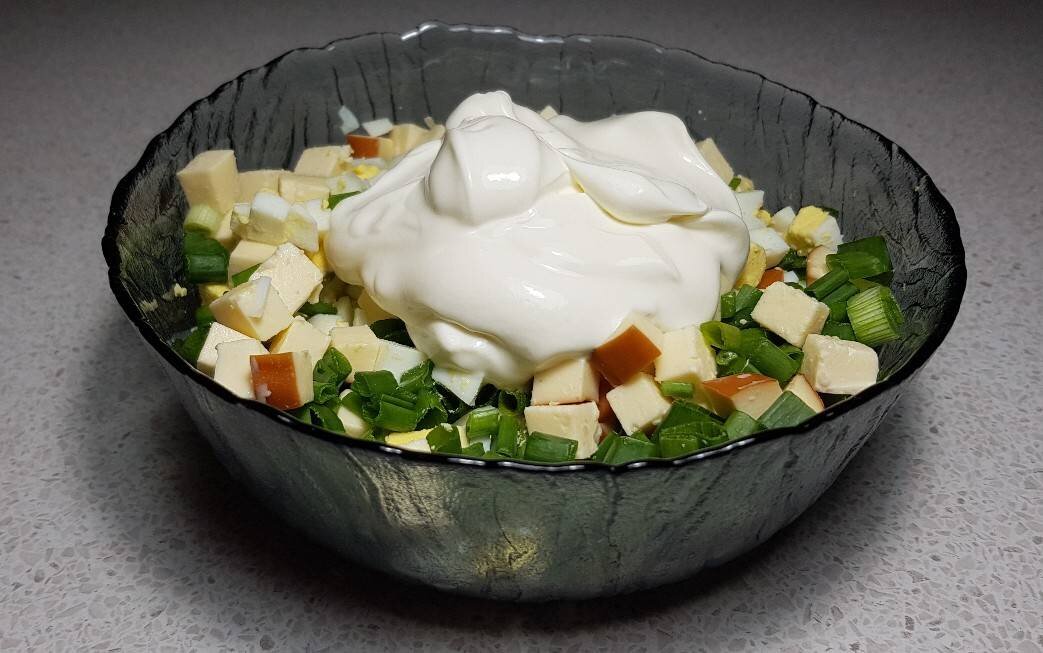 Легкий весенний салатик. Быстро, необычно, вкусно 😋 #готовимвместе Ингредиенты: Яйцо, Колбасный сыр , Зелёный лук, Сметана, Подсолнечное масло, Соль Способ приготовления: Яйца отварили. Чтоб скорлупа легко снималась, опускаем яйца в холодную воду. Затем очищаем, режем кубиками. Сыр тоже нарезаем кубиками. Лучок моем, режем. Добавляем сметану и 3-4 ст.л подсолнечного масла. Солим. Перемешиваю перед подачей. В качестве дополнения к салату), у меня пюрешка и куриные отбивные в кляре. Приятного аппетита!!!
