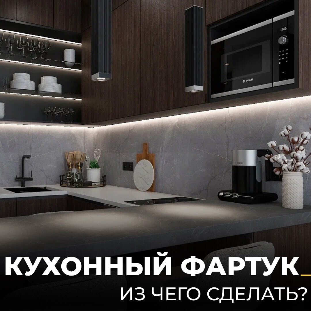 Кухонный фартук защищает рабочую зону от жира и украшает её, поэтому важно выбрать практичный и красивый вариант, который хорошо впишется в интерьер вашей кухни. Основные варианты кухонных фартуков: ✅ АКРИЛ (ИСКУССТВЕННЫЙ КАМЕНЬ) Пластичный, долговечный материал, не тускнеет и не выгорает, его легко мыть. Со столешницей соединяется без швов, поэтому великолепно выглядит. Единственный минус этого материала — его стоимость. ✅ КЕРАМИЧЕСКАЯ ПЛИТКА Самый распространённый вариант. Из-за большого ассортимента, прочности, разнообразия фактур и цветов. Единственный совет: для кухни приобретайте гладкую плитку, её легче мыть. Из недостатков: необходимо тщательно выравнивать стены, много пыли и грязи. Поэтому лучше сначала уложить плитку, а потом устанавливать кухонную мебель. ✅ СТЕНОВЫЕ ПАНЕЛИ НА ОСНОВЕ МДФ Из недостатков: панели «живут» меньше, чем кафельная плитка, имеют стыки, цвет обязательно совпадает со столешницей и пристенным плинтусом. Из плюсов: ламинированные панели на основ