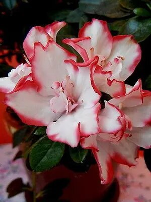 Азалия-кустарник семейства вересковые-обильно цветет с января по апрель красивыми цветками, различными как построению,так и по величине и окраске. Листья супротивные, цельные, на коротких черешках, сверху-темно-зеленые,снизу-салатные скрасными прожилками. Вредители и болезни: Паутинный клещик. Выращивание: Для растения необходима высокая влажность воздуха, почва также должна быть всегда влажной. Во время цветения полив увеличивают, а опрыскивание прекращают. Для формирования кроны азалию неоднократно прищипывают. Размножение: Стеблевыми черенками, после цветения.