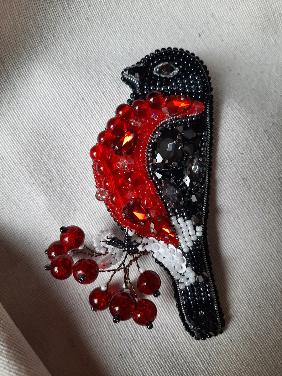 Всем доброго времени суток! Очередь дошла и до брошей наконец))) Все свое рукоделие я публикую для собственного удобства в том же порядке, в каком выкладывала в иных соцсетях, в том числе и новой NOW (посмотрим, что там у них получится, но пока я верю в ее лучшее будущее, ребята стараются и вроде постепенно у них все получается). Брошами я решила заняться после первого же случайного видео в ныне запрещенном Инстаграме. Мне нравится смотреть на стразы, бусины, все эти переливы, хотя в повседневной жизни никогда их не ношу. Обратив внимание на такие изделия, поняла, что здесь и с камешками, бусинами можно повозиться и заодно попробовать что-то новое для себя. В качестве первого опыта решила я попробовать сделать снегиря. Нашла мастер-классы, и нет, чтобы все сделать по ним, начала делать по-своему :D вечная проблема у меня в том виде творчества, где нет четкой схемы, как в вязании или вышивке крестом. Итог получился не совсем тот, на который рассчитывала, есть и косяки, но все же я довол