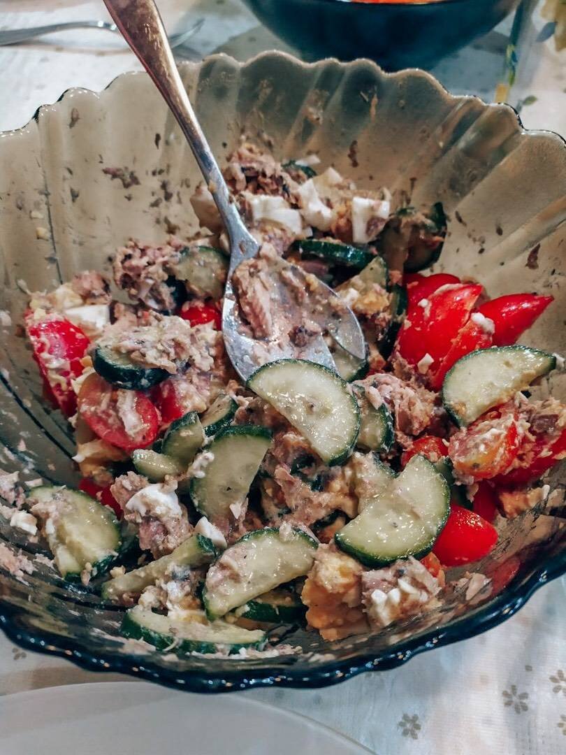 Салат с сайрой и огурцами очень легкий в приготовлении и получается интересным по вкусу. Подходит для тех кто соблюдает диету. Такой салат обычно готовят для обыденного употребления, но если красиво уложить на блюдо, то вполне можно и на торжество #салат #салатсрыбой #салатссайрой #готовимвместе Ингредиенты: консервированной сайры, огурца, помидора, яиц, растительного масла, сахара, соль, лимонного сока Способ приготовления: Яйца отвариваем вкрутую. Огурцы и помидоры нарезаем ломтиками. Выкладываем овощи в салатницу. Рыбу достаём и отряхиваем от сака, удаляем крупные кости и разминаем ее вилкой. Яйца очищаем и нарезаем крупными кубиками. Готовим заправку. В растительное масло добавляем соль, сахар перец и лимонный сок, тщательно перемешиваем. Поливаем салат получившейся заправкой и даём немного настояться. Готово!