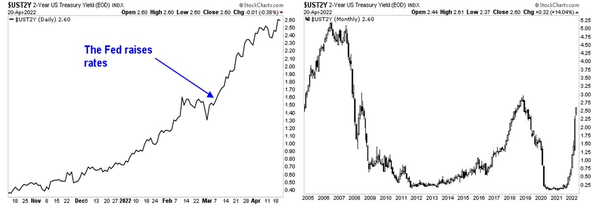 💬 Мнение: как я уже говорил несколько недель назад, финансовая система сейчас переживает свое первое скоординированное ужесточение центрального банка за более чем десятилетие. Причиной этого ужесточения является инфляция. Инфляция - глобальное явление. Как только он появляется, он повсюду. Это так сегодня. По факту, нынешняя финансовая система основана на долгах. Суверенные облигации, особенно казначейские облигации США, являются основой финансовой системы. Это самые старшие активы, принадлежащие крупным финансовым институтам. А доходность этих облигаций представляет собой “безрисковую” норму доходности, по которой оцениваются все активы (акции, товары, недвижимость и прочее). Доходность облигаций резко возросла из-за инфляции. Именно это вынудило центральные банки начать ужесточать денежно-кредитную политику. Но до сих пор они не могут замедлить, не говоря уже о том, чтобы убить инфляцию. Центральный банк США, Федеральная резервная система (или ФРС) повысили ставки на 0,25% в марте.