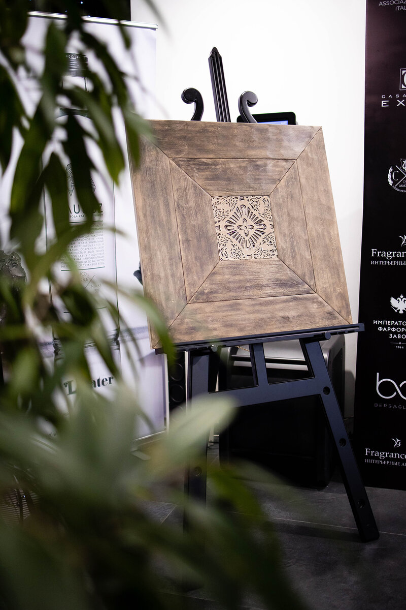 Коллекция паркетных модулей, созданных вместе с известным скульптором и художником-керамистом Владимиром Ковалёвым, – один из примеров синтеза рукотворного и высокотехнологического. Здесь соблюден баланс между утилитарностью и произведением искусства.