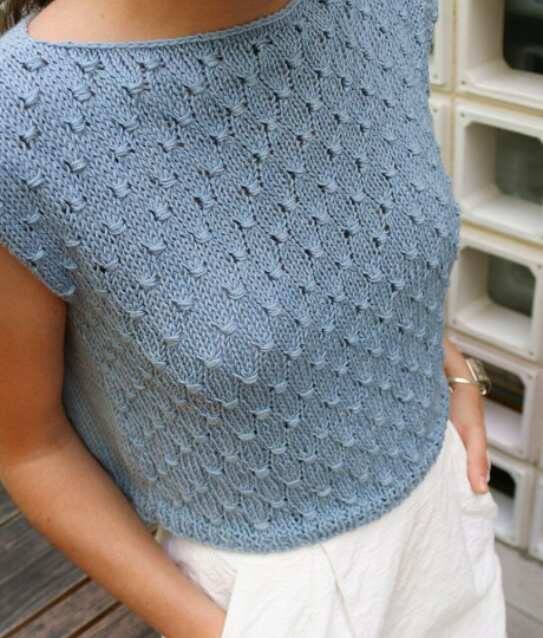 Не смотря на то, что этот хлопковый топ связан по принципу «наволочки» , смотрится эффектно и элегантно! Вам не потребуется никакой выкройки, пройм и сложных расчетов — просто два прямоугольника, сшитые между собой по плечевым и боковым швам. Изюминкой этой кофточки является интересный узор, который вяжется проще, чем выглядит. Узелки на полотне это простое обвитие связанных петель нитью. Для вязания топа Вам потребуются: ОПИСАНИЕ УЗОРА СБОРКА ИЗДЕЛИЯ Складываем перед и спинку лицевыми сторонами внутрь и соединяем плечевую часть крючком для вязания трикотажным швом. А так же боковые части изделия. Ваш летний топ связанный спицами готов! Желаем вам успехов в вязании и если возникнут вопросы, пиши в комментариях!