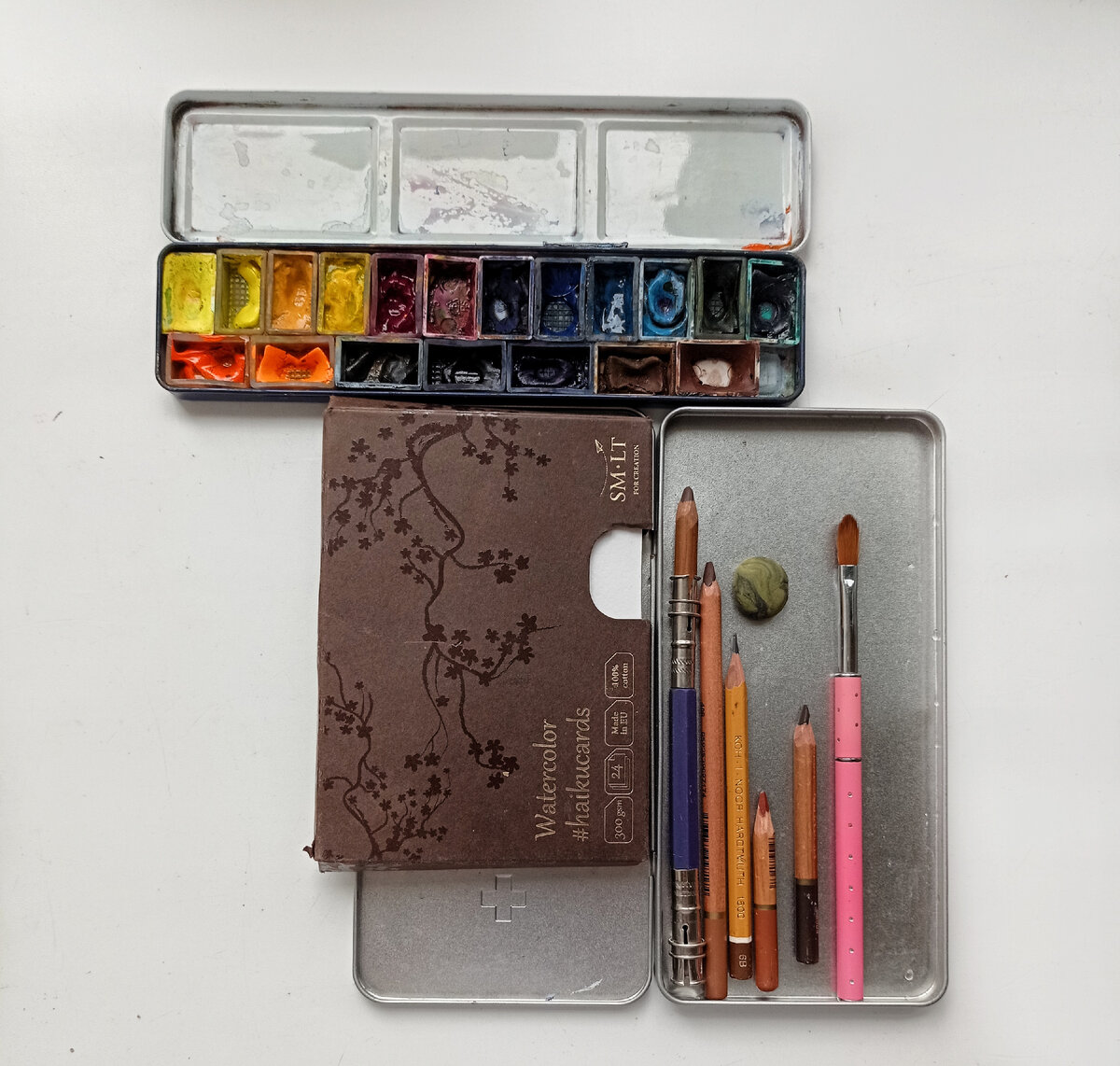 Собраться на пленэр легко! На фото я выложила минимум вещей, чтобы вам было наглядно. Даже в дамскую сумочку влезет! Итак, нужно взять с собой: — бумагу, салфетки; — карандаши, ластик; — острую кисточку; — краски и палитру. Это основное. Теперь к деталям Как я собираю свою пленэрную сумку? Беру бумагу на разные случаи: склейку, сзади которой есть картонка, папку А4 для акварели, набор для рисования открыток (как на фото). Беру скотч, чтобы приклеивать к картонке листок А4. Беру стаканчик и бутылку воды. Кисти достаточно одной хорошей, если рисовать наброски не больше А4. Беру тряпку, чтобы не сорить салфетками. Краски у меня в металлической коробке с белой внутри крышкой, которая заменяет палитру. Карандаши тоже держу в коробке, как простые для рисунка под акварель, так и разные самодостаточные для набросков. И, да, важный пункт: всё должно быть максимально удобно! Ничего не должно разлетаться от малейшего ветерка. Ну и анекдот Собирается на пленэр художник. Мама помогает ему, кладёт