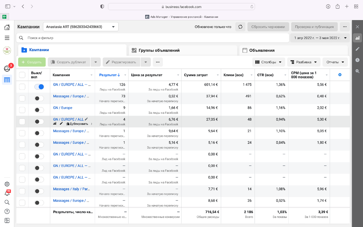 В рекламных кампаниях тестировали еще геолокации. Лучше всего сработали: Германия, Италия, Испания, Франция. Рекламные макеты: Про макеты много говорить не будем. Работают только нативные и говорящая голова, все. Итог: Потратили 716,5