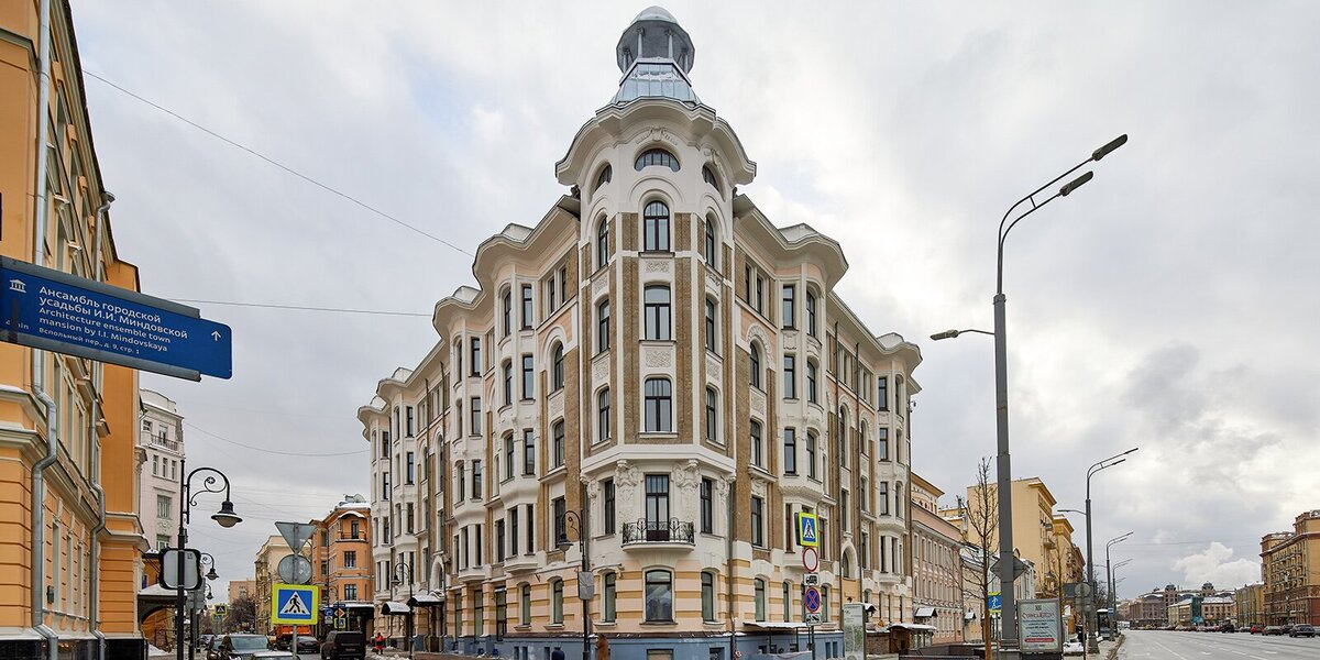 Бывший доходный дом П.А. Скопника Улица Спиридоновка, дом 27/24 Дом, построенный в 1906 году архитектором Густавом Гельрихом, относится к стилю модерн. Первое, что обращает на себя внимание, — волнообразный фасад, который повторяют очертания карниза. Эффект волны создают эркеры — они тянутся рядами со второго по пятый этаж по всем фасадам, которых у здания три. Дело в том, что оно стоит на пересечении трех улиц — Спиридоновки, Садовой-Кудринской и Вспольного переулка. В Санкт-Петербурге много домов, расположенных таким образом, а для Москвы это редкость. Фасады отделаны керамической плиткой и лепниной в виде цветочного орнамента. Угол дома (на пересечении Садовой-Кудринской и Спиридоновки) выполнен в виде эркера-башни, которую венчает бельведер — небольшая беседка. На уровне второго этажа вокруг чугунного балкончика можно разглядеть скульптуры в виде атлантов, подпирающих башню. Фото: mos.ru
