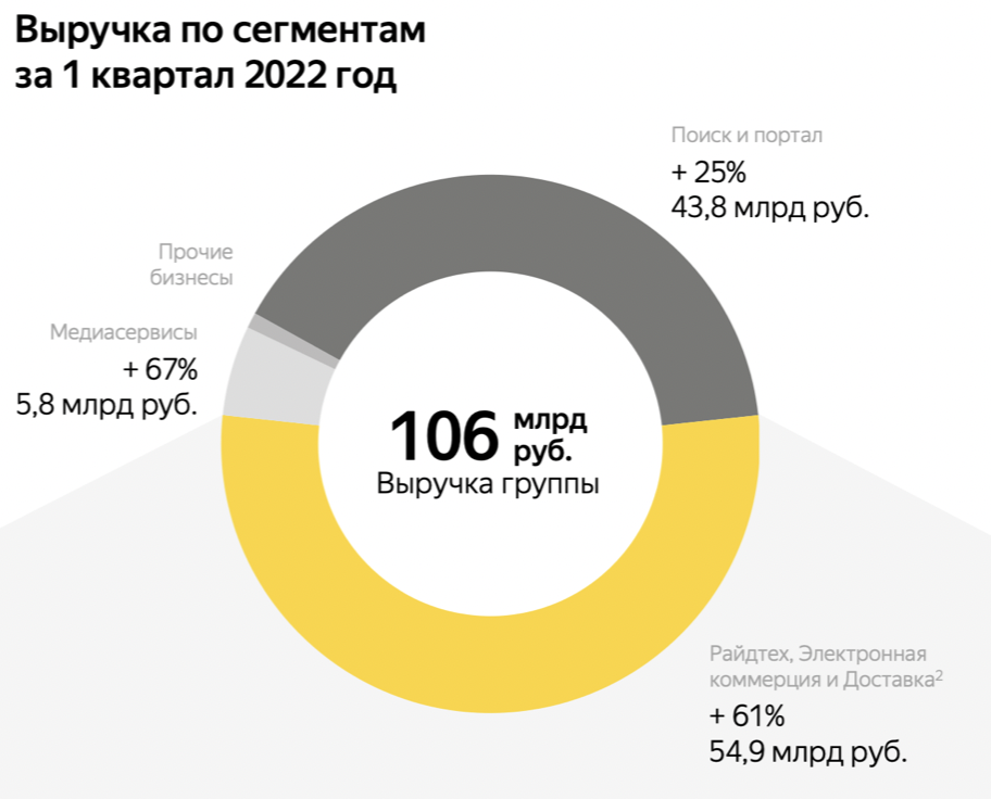 "С одной стороны – рядовое событие в жизни компании, с другой – сейчас особенно важно продолжать быть прозрачными для рынка, наших инвесторов и партнеров и рассказывать о том, что происходит с нашими бизнесами" 👈🏻 такими словами сама компания комментирует отчет Яндекса за 1 квартал 2022 года. «Золотые слова», дальше можно не читать отчет, беру. Но это был бы не я, если бы не проанализировал отчет компании, а результатами не поделился с вами, поэтому... Общая выручка Группы за отчетный период выросла на 45% до 106 млрд рублей. Отличные показатели, но могло быть и лучше. Даже сама компания заявляет, что на деятельность некоторых направлений негативно повлияли геополитические события. Все это выльется в результатах, но обо всем по порядку. Основной сегмент бизнеса - Поиск и портал продолжает генерировать основной доход, даже несмотря на уход с рынка международных рекламодателей. Скорректированная EBITDA выросла на 8% на фоне общего роста выручки на 25% до 43,8 млрд рублей. Из сегмента у