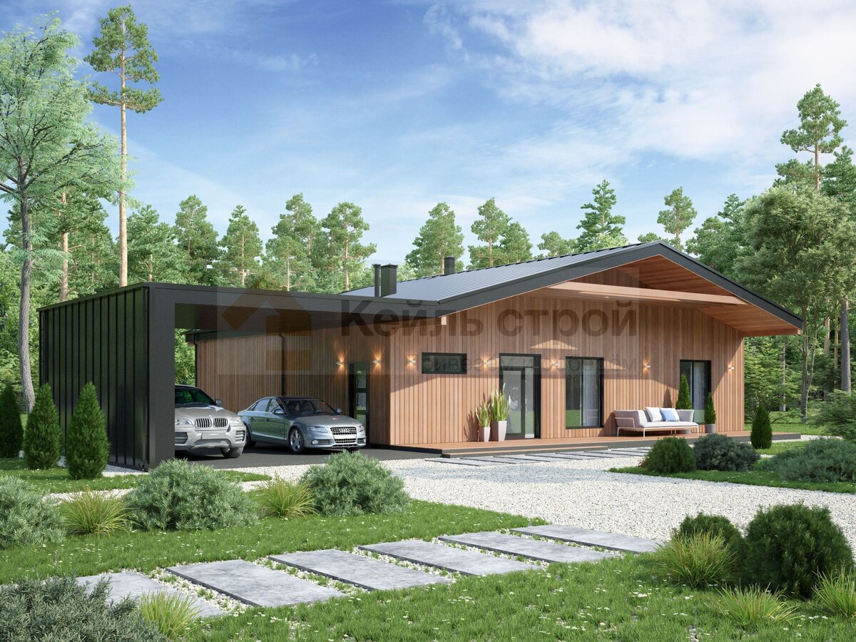 Одноэтажный каркасный дом ДМ-15 242,46 кв. м. с террасой и навесом для автомобиля