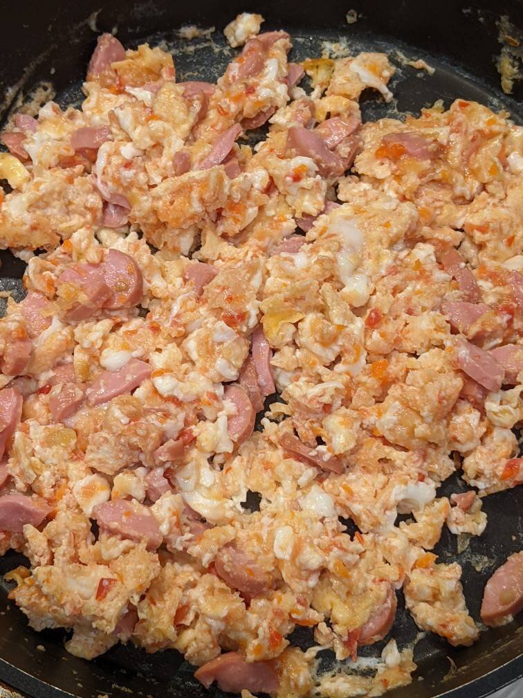 Адаптация турецкой яичницы с помидорами под российские реалии, т.к. хорошие помидоры на вес золота, придумала заменять их аджикой домашнего приготовления. #академия #готовимвместе #яичница #завтрак Ингредиенты: Яйца, домашней аджики, Сосиски, Оливковое масло Способ приготовления: Наливаем на сковороду оливковое масло. Разрезаем вдоль две сосиски, у меня баварские с сыром, режем мелко полукольцами и в сковороду. Обжариваем помешивая, уйдет лишняя жидкость. Разбиваем 4 яйца, можно делать глазунью, я в этом рецепте люблю когда перемешиваем. Аджика а тот год получилась солоноватой и идеальной по остроте, поэтому соль, перец не добавляю. Смотрите по вкусу вашей аджики. Перемешиваем пока яйца не станут той консистенции которую любите. выкладываем на тарелку. Приятного аппетита 🤗