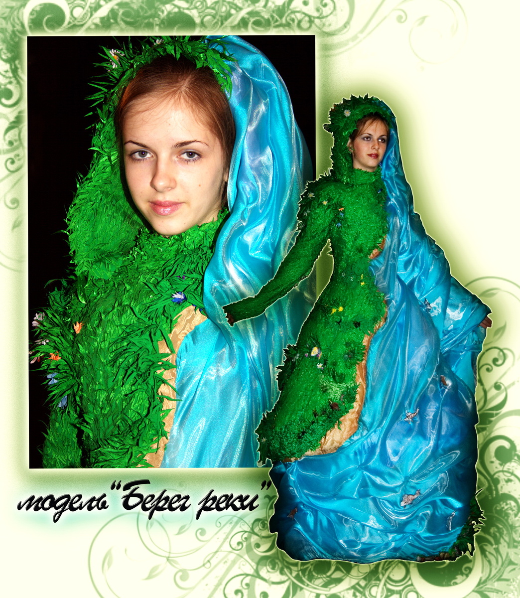 Модель из коллекции, навеянной красотами русской природы.. Трава, цветы, бережок, речка, а в реке - рыбки , камушки... Элементы, тонкие,мелкие, сложные -выполнены при помощи выжигания по ткани (гильоширования).